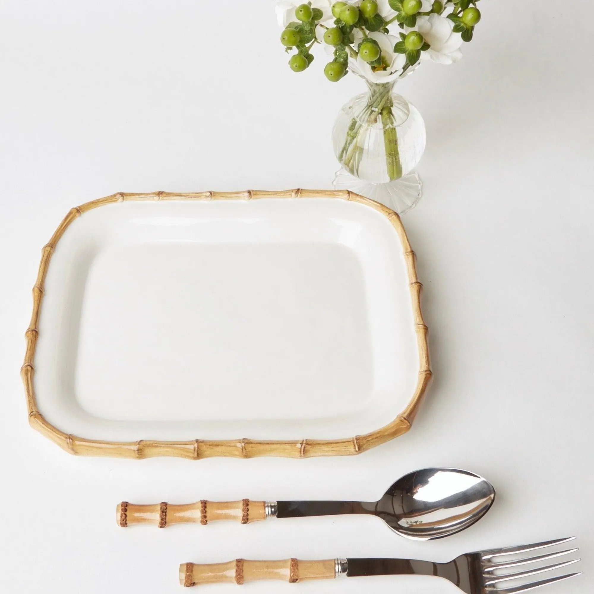 Our Bamboo Rectangle Platter Named After Alice’s Daughter, Features An Elegant Hand Painted Bamboo Rim.Accompanied By The Nancy Bamboo Starter Plate It Matches Beautifully With Our Ivory Cutlery.Made For Us By Juliska. Size: 30 X 24 Cm