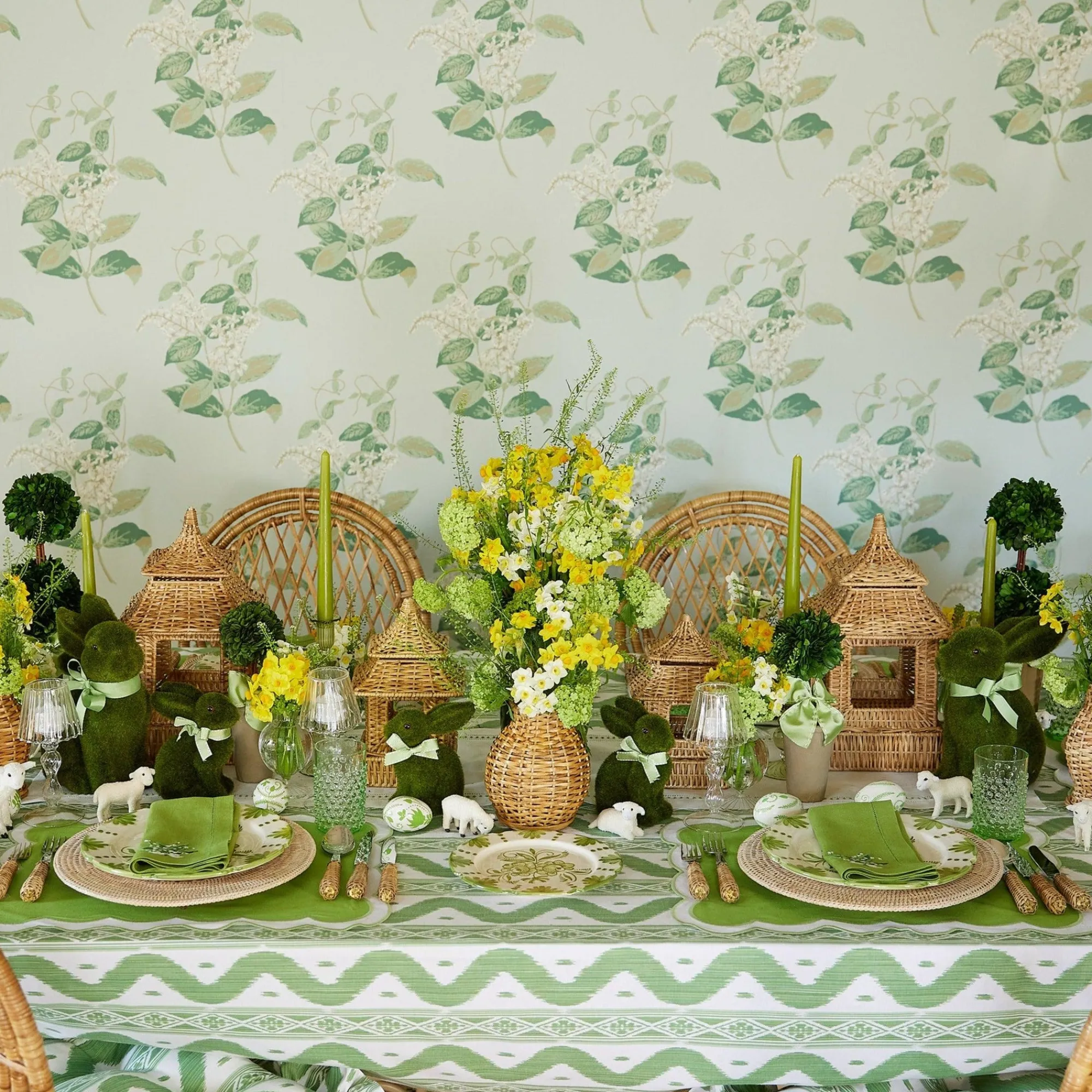 This Delightful And Joyous Decoration Set Is An Effortless Way To Decorate The Centre Of Your Table This Spring & Easter.Bringing The Meadows Of Spring To Your Home, This Lush Green Set Works Perfectly On Any Mantlepiece Or Hall Table Too.Pair It With Our Green Ikat Tablecloth, Serena Green Applique Placemats & Natural Rattan Charger Plates.One Set Includes:X2 Ribboned Potted Boxwood Ballsx1 Large Moss Bunnyx2 Small Moss Bunniesx5 Lamb Familyx4 Hand Painted Eggsx2 Nancy Bud Vasesx1 Mrs. Alice Decorative Mossx1 Ribboned Magnetic Seal Boxshot At Founder Alice’s Welsh Family Home.