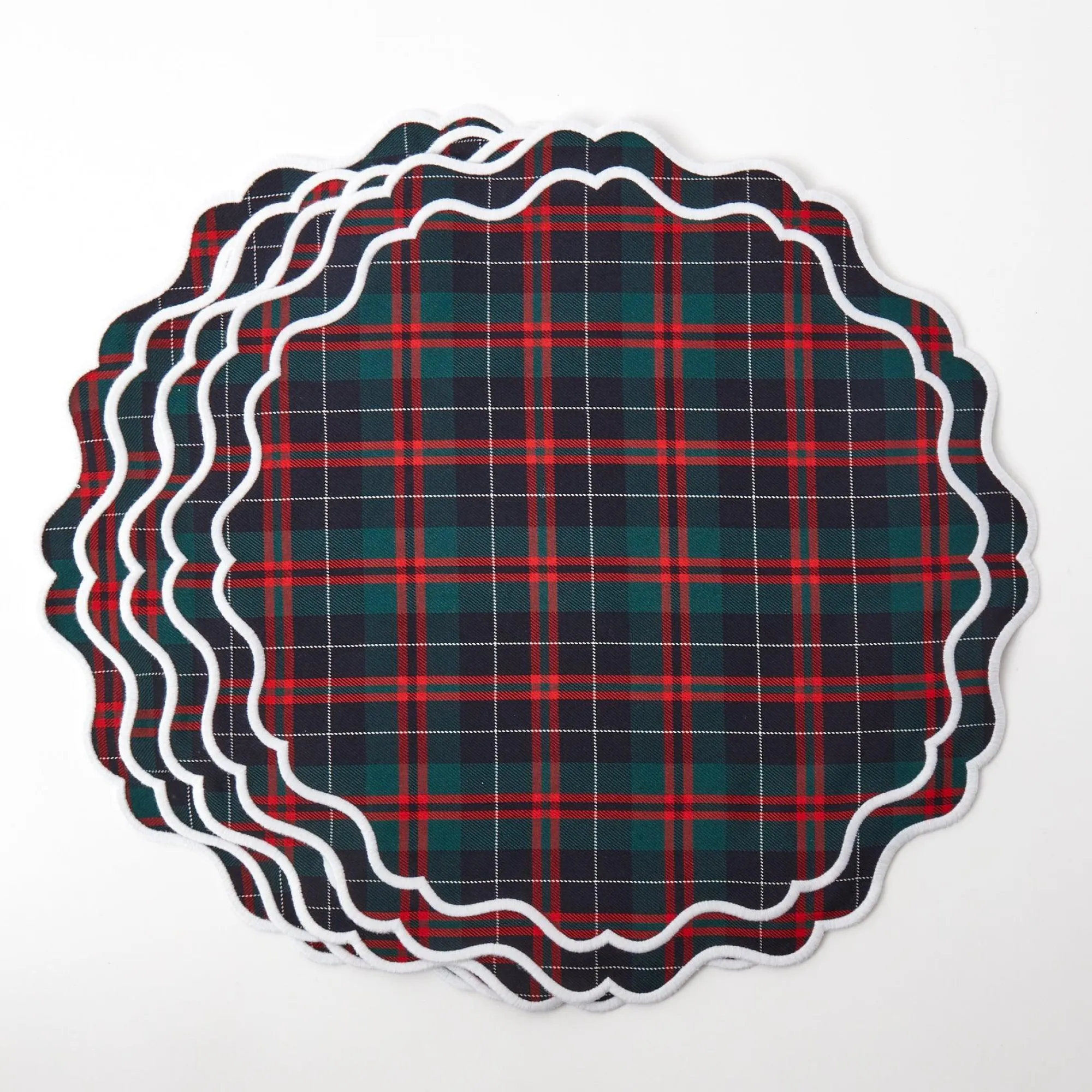 These Festive Round Placemats, In Our New Katherine Shape, Come In An Enchanting Tartan Of Red, Green And Navy Blue.With…