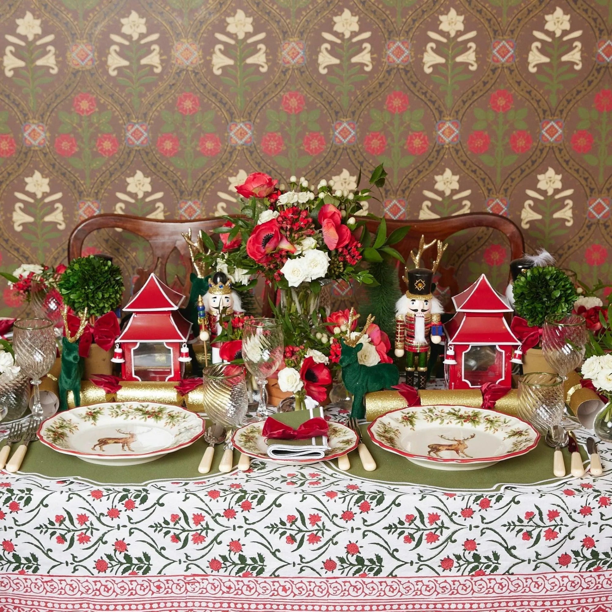 This Rich And Colourful Tablecloth With Floral Garlands And Seasonal Cheer Comes In Festive Tones Of Red, White And Green.Designed In Three Sizes, Lay This As A Start To Any Christmas Or Thanksgiving Table With Our Liberty Forest Green Placemats And Napkins, Reindeer Dinner Plates & Ivory Cutlery.Small (175Cm X 275Cm)Medium (225Cm X 275Cm)Large (225Cm X 350Cm)Care Instructions: Machine Wash On A Cold Cycle Or Hand Wash And Leave To Air Dry.Do Not Tumble Dryiron On Reverse