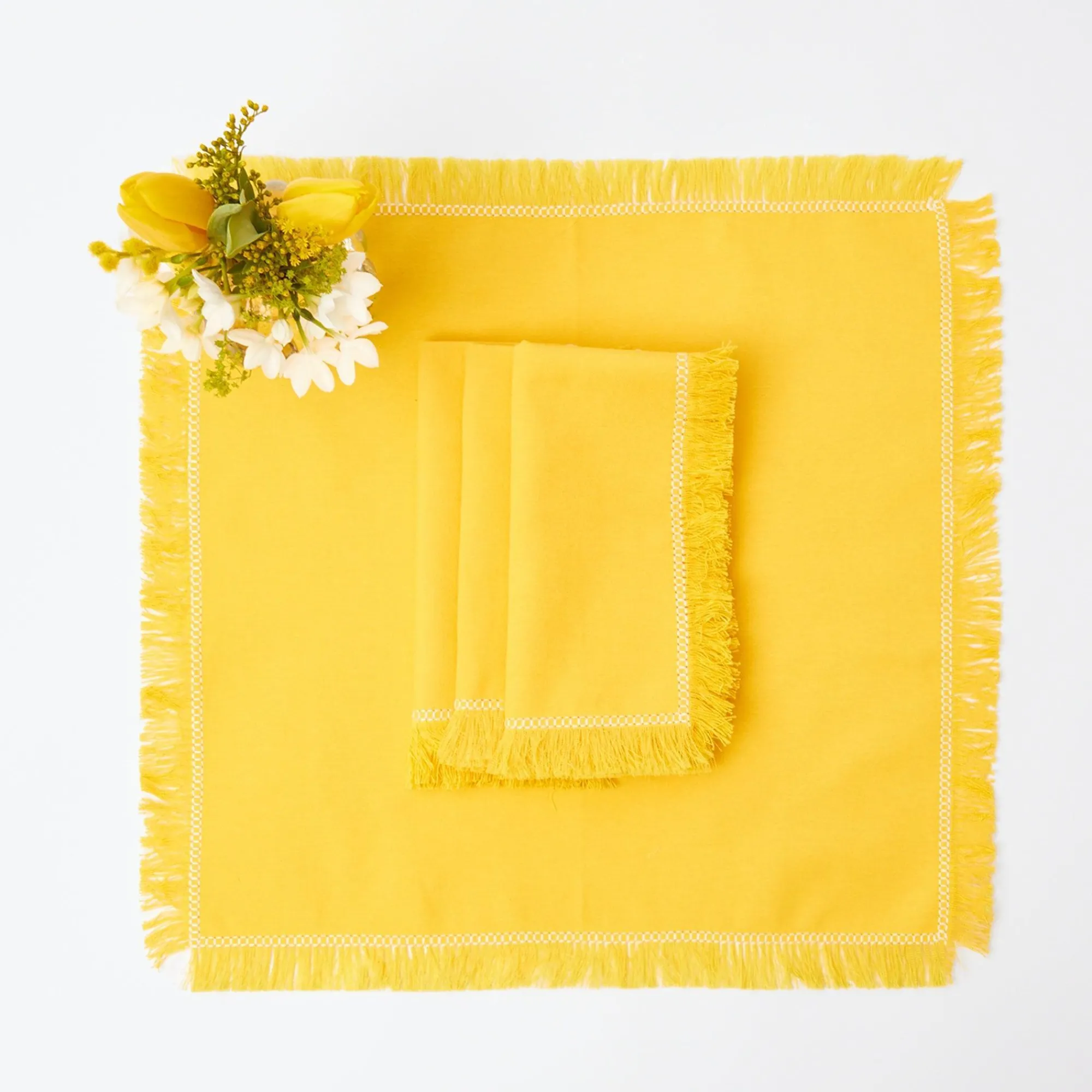 Our Delightful Yellow Fringe Napkins Complement Any Table Looking For A Little Ray Of Sunshine.With Their Fringed Border And Delicate White Embroidery, They Add A Cheery Note To Any Table.Set Includes:X4 Yellow Fringe Napkin (38Cm X 38Cm)Care Instructions: Machine Wash Cold. Do Not Tumble Dry.We Offer The Option To Personally Bespoke Your Napkins With Our Mrs. Alice Monogram Service. If You Would Like To Opt For This, Please Enter Up To 2 Initials In The Box Provided. Please Allow An Extra 2-5 Days From The Time Of Your Order For Monogramming.For Bespoke Quantity Of Placemats And Napkins Please Email [email protected].